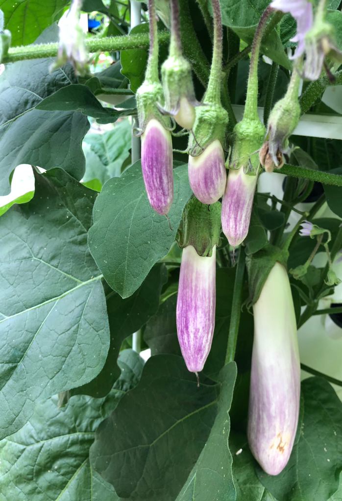 Though Eggplants are fairly simple to grow, they are heavy feeders. We keep our Eggplant pH around 6.0 and PPM around 2000. Check water levels during the summer every 2 days and be sure to add nutrients when you top off with water. Eggplants are heavy feeders and slurp up the water and nutritions like tomatoes. Remember to check the pH of your water with a pH meter an hour after adding nutrients and adjust as needed. Calibrate your pH meter twice a month (every two weeks) and keep tip of pH sensor moist at all times.