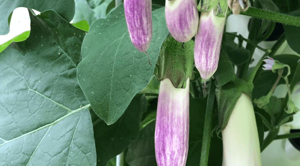 When you begin to see buds/flowers, we encourage hand pollinating each flower for fruit set to occur. The picture above shows how the eggplant forms (at various stages) after pollination. The fruit will range in size. Know that earlier fruiting will be longer (10-12″) and later fruit set may be shorter as the plant ages. If you harvest the fruit while still small, you can eat fresh without cooking. We find however, that the mature fruit is excellent cooked along with meat or as a meat substitute. The texture of this is fantastic and kid-approved in our home.