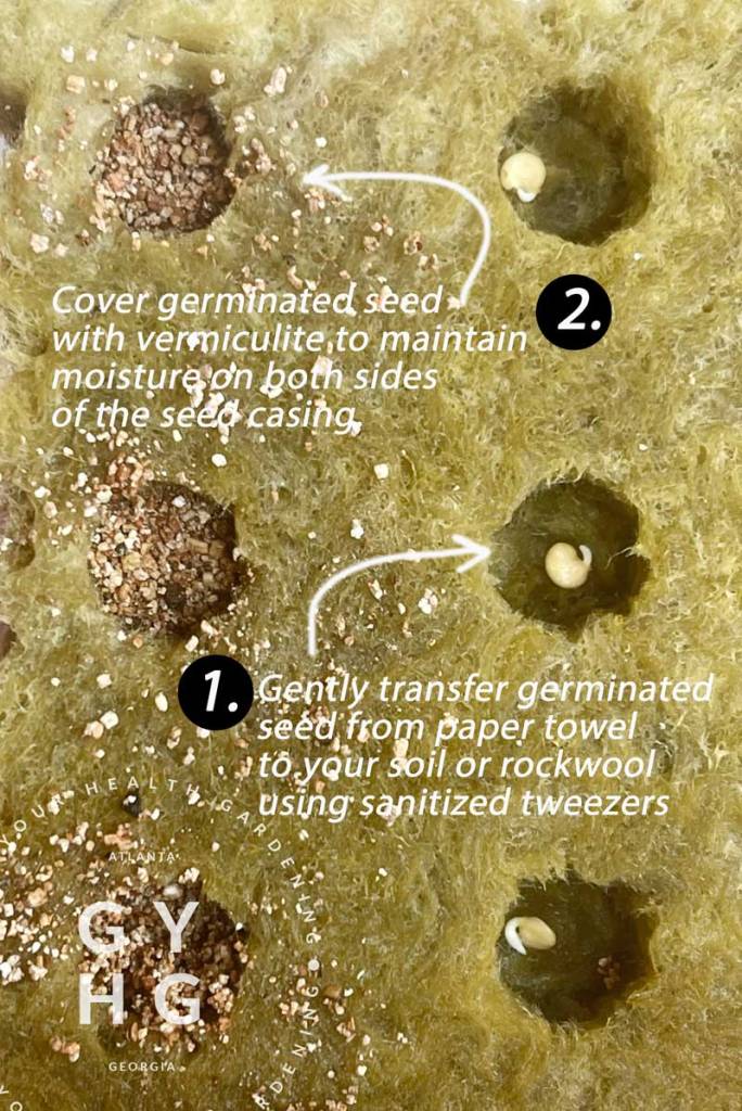 I like to cover my seeds with vermiculite. Some hydroponic growers insist that this step isn’t necessary, but I like to make sure my seeds receive adequate moisture throughout these early stages of growth especially. Strong healthy seedlings, make for strong healthy plants. I use this process for pepper, tomato, and eggplant seeds and any seeds that are not super small. Remember, some seeds need light to germinate (like lettuce), so be sure to reference our cheat sheet under seed starting on growyourhealthgardening.com before starting seeds to know if your seed needs light, no light, or if it doesn’t matter.