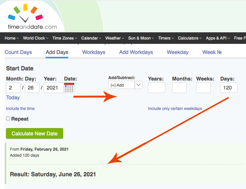 To quickly calculate your harvest date, use the formula above and enter that number into this handy date calculator. (Make sure you use the tab for “Add or Subtract Date”. (See blue line under “Add Days” in example screen shot below.) Begin by entering your date of seed starting and calculate days of germination, plus two weeks for seedling growth, plus days to maturity from seed packet or catalog description. This will give you total number of days. Make sure the Add/Subtract drop down has selected “(+) Add” and then enter a numerical value under “Days” and hit “Enter” on your key pad. Below, you will be given the “Result” date. This is what you will write on your label.