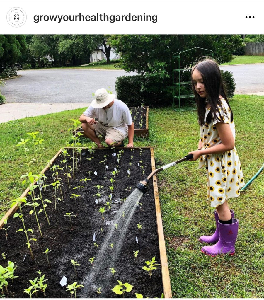 Our seven-year-old daughter waters in her Sunflower and Zinnia transplants while her big brother, Joshua, helps with finishing touches to the flower bed. I love how gardening brings our family together. Photo: Follow us on Instagram @GrowYourHealthGardening