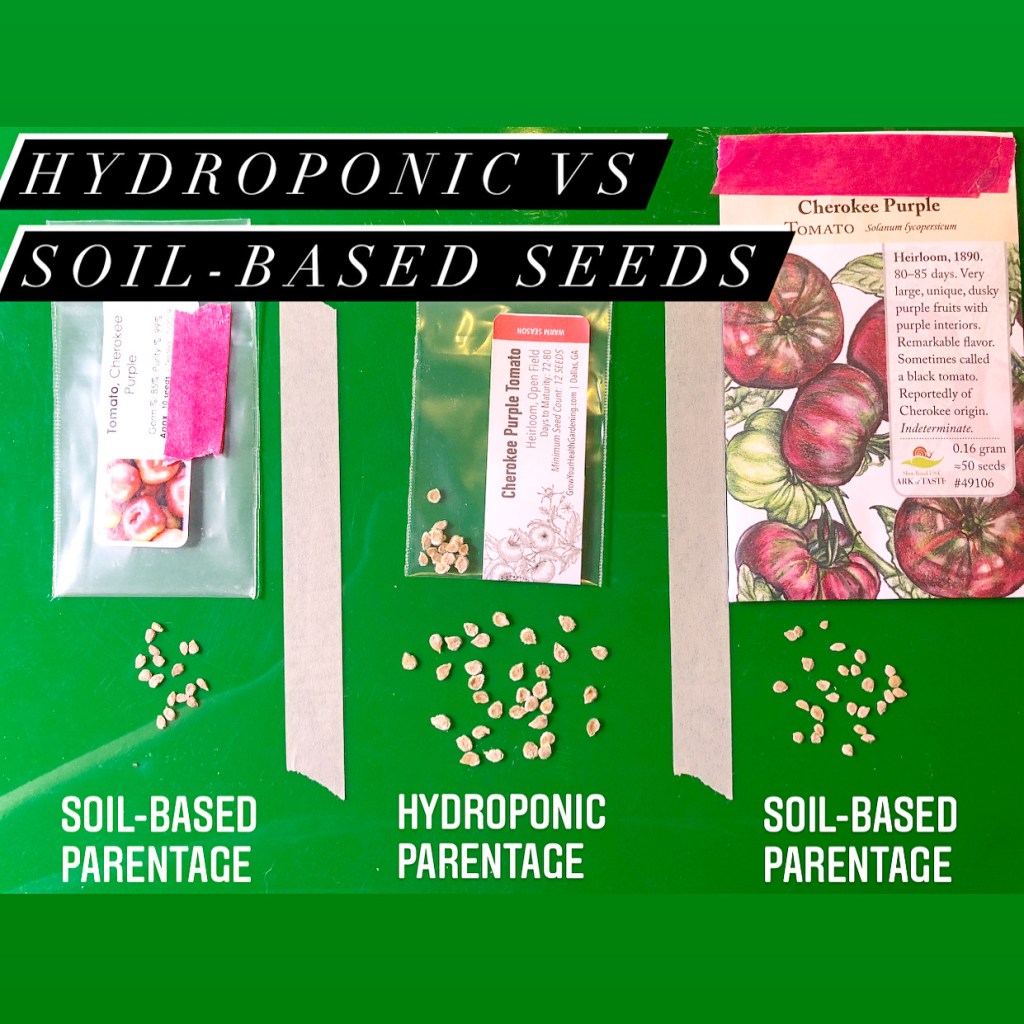 Same variety (Cherokee Purple), but the two on the left and right are soil-based seed. Our hydroponic seed is in the middle. We think there’s not only DNA Epigenetic differences that you can’t see, but also a noticeable visual difference.